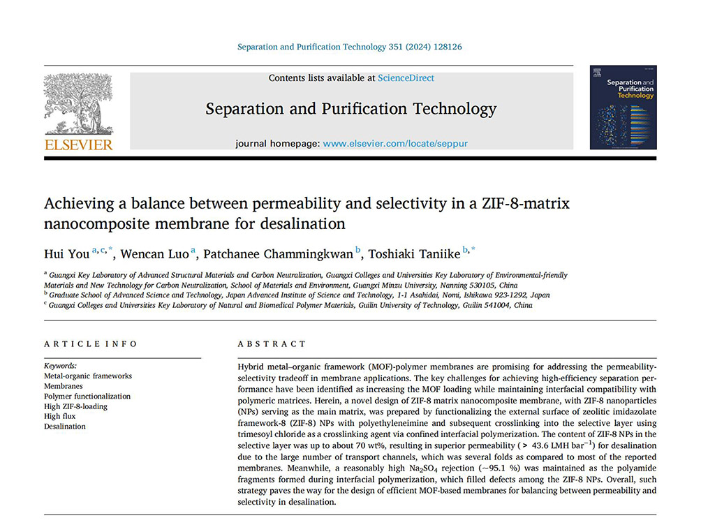 近日,公司青年教师尤慧博士与日本北陆先端科学技术大公司大学Toshiaki Taniike教授合作,在国际分离和纯化领域权威期刊、中国科公司一区TOP期刊《Separation and Purification Technology》(分离纯化技术)上发表了题为“Achieving a Balance between Permeability and Selectivity in a ZIF-8-matrix Nanocomposite Membrane for Desalination”的学术论文。论文第一作者兼通讯作者为尤慧博士,bevictor伟德为该论文第一完成单位,该研究工作得到了bevictor伟德引进人才科研启动基金的资助。