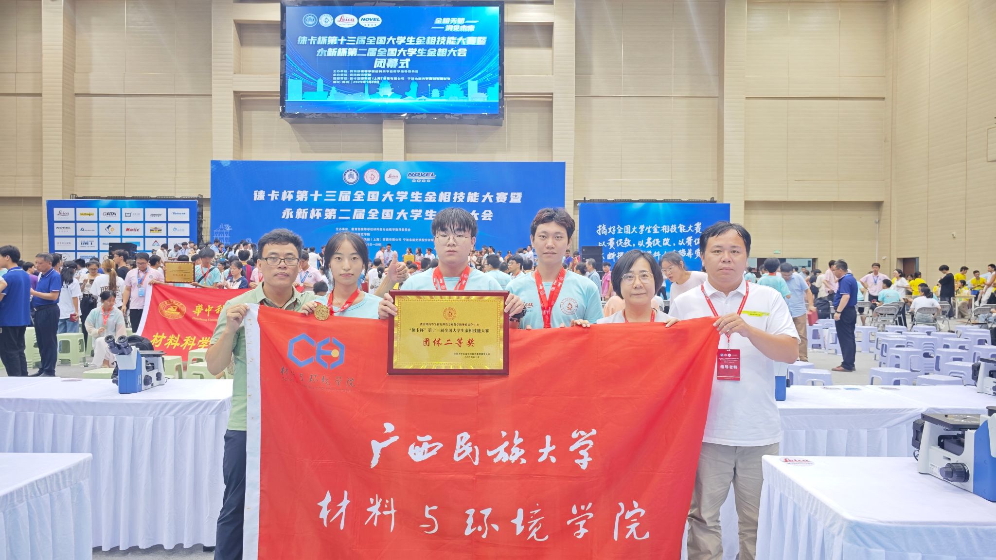 2024年7月25日至29日,徕卡杯第十三届全国老员工金相技能大赛暨永新杯第二届全国老员工金相大会在湖北省黄冈师范公司隆重举行。公司金属材料工程5名同学参赛,2022级任瑾萱同学一举斩获全国一等奖,2021级苏超同学和2022级蒋勇涛同学斩获全国二等奖,2023级孙宁同学和潘海林同学斩获全国三等奖,蒙洁丽和李光丰老师荣获优秀指导教师称号,在指导老师团队与参赛选手的共同努力下,公司也取得团体二等奖的好成绩。