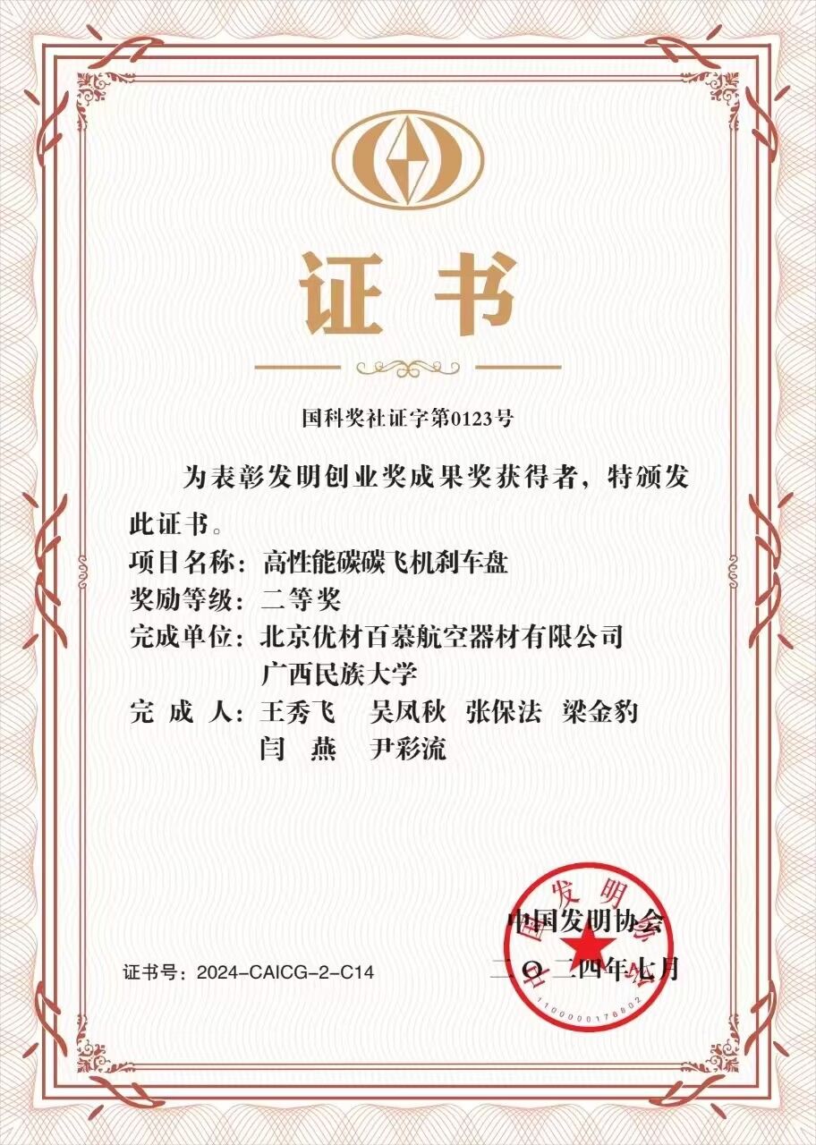 近日,2024年度发明创业奖名单正式发布,公司尹彩流研究员参与的项目“高性能碳碳飞机刹车盘”荣获中国发明协会创业奖成果奖二等奖。该奖项是由国家科技部批准,中国发明协会设立的国家级奖项,旨在促进产学研深度融合,推动发明创新事业高质量发展。