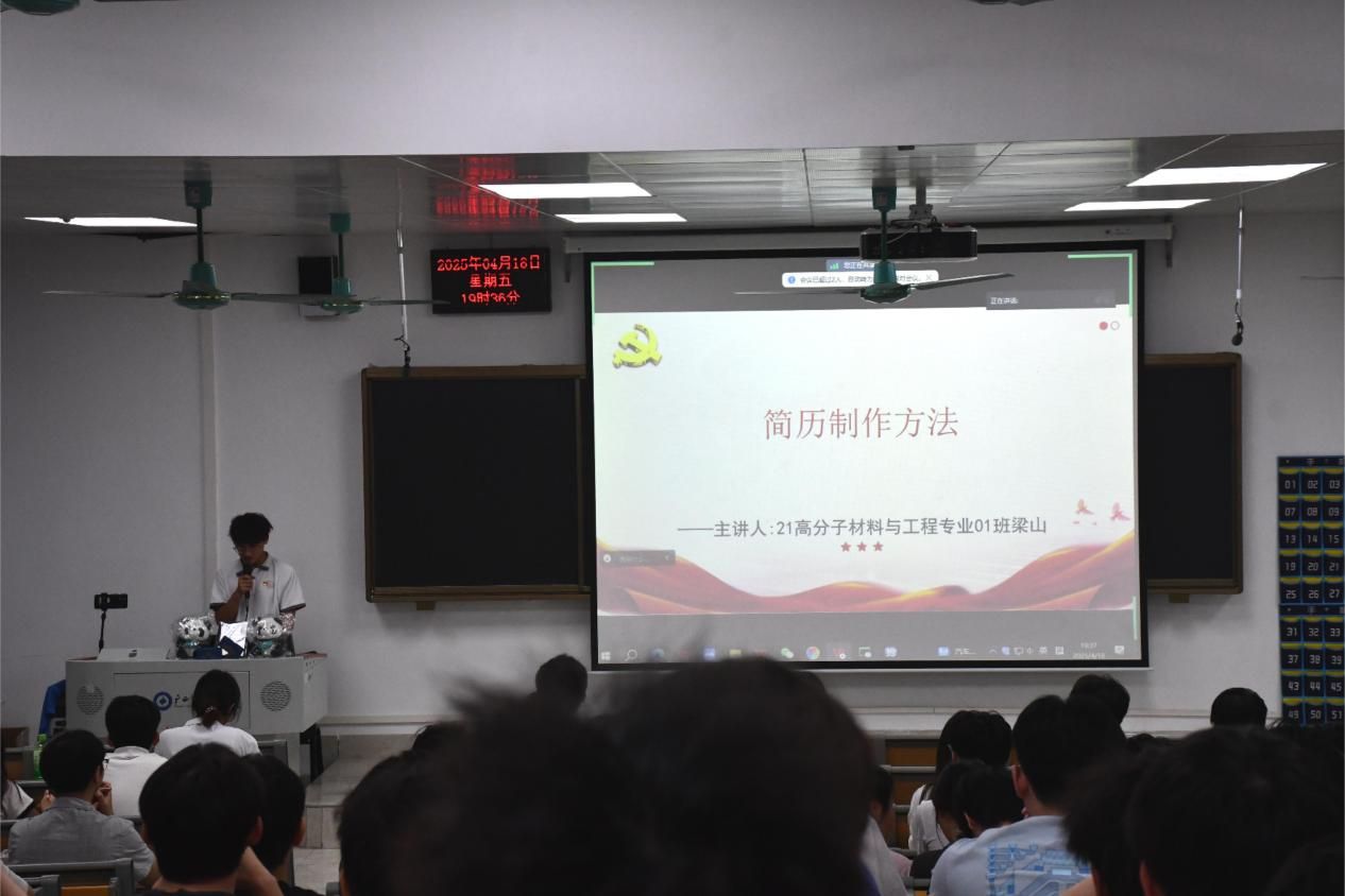 活动第三个环节,2021级金属材料工程专业的梁元超同志为大家分析了金属专业的就业前景,讲述了金属材料工程专业的就业技巧和求职方向,鼓励大家要认真学习专业技能,重视毕业实习,努力提升个人就业竞争力。