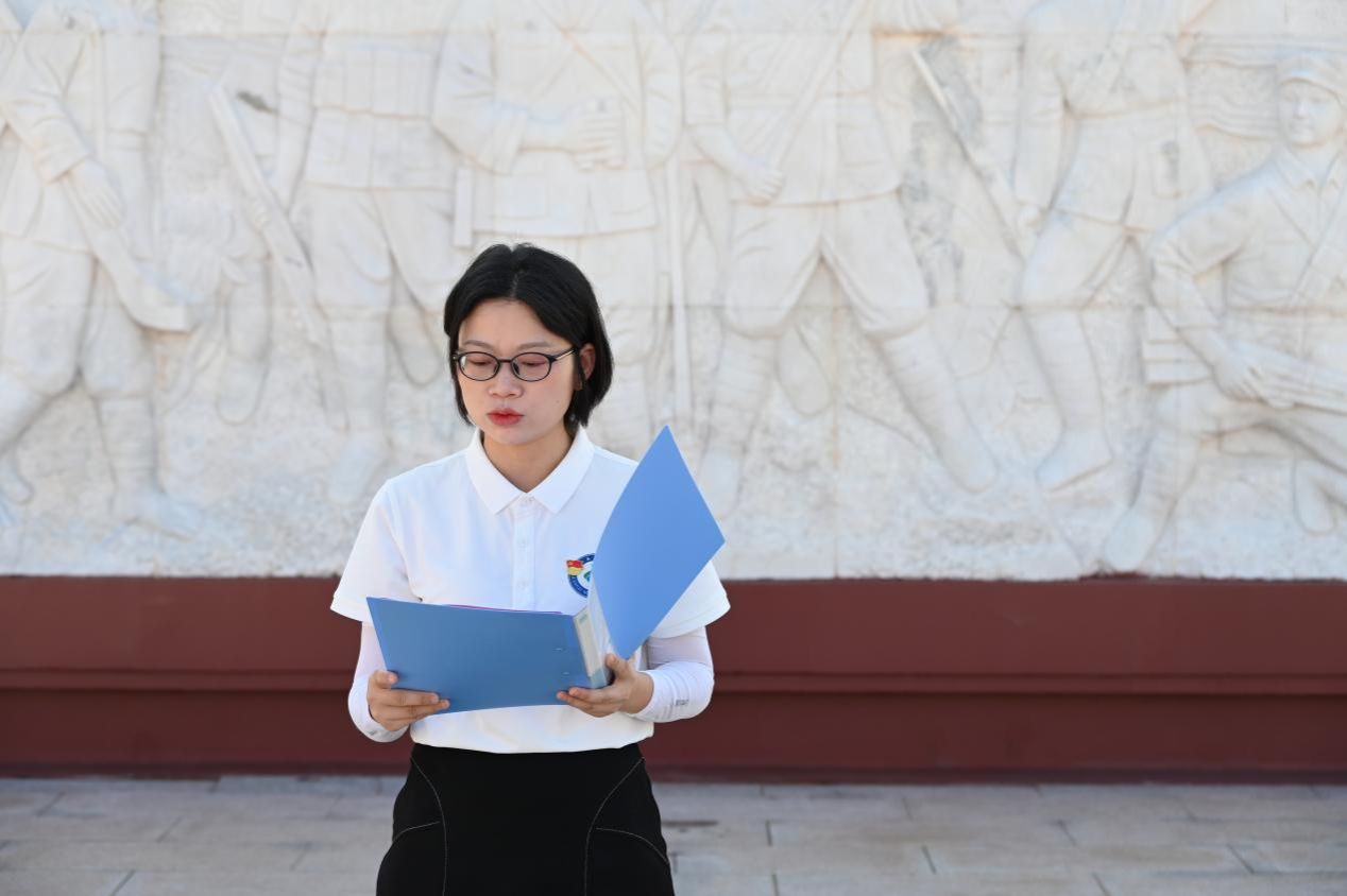 青春表态传薪火,强国有我勇担当。教师代表韩燕在纪念碑前作主题发言。她结合自身学习与工作经历,分享了对抗战精神的深刻感悟,激励青年学子要从抗战历史中汲取奋进力量,让信仰之基更加牢固,让红色基因代代相传,让复兴伟业接力奋进。朴实真挚的话语凝聚着对青年一代的殷切期望,引发在场师生的强烈共鸣。