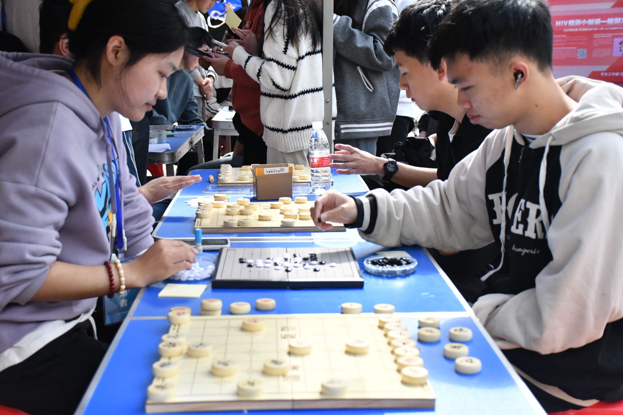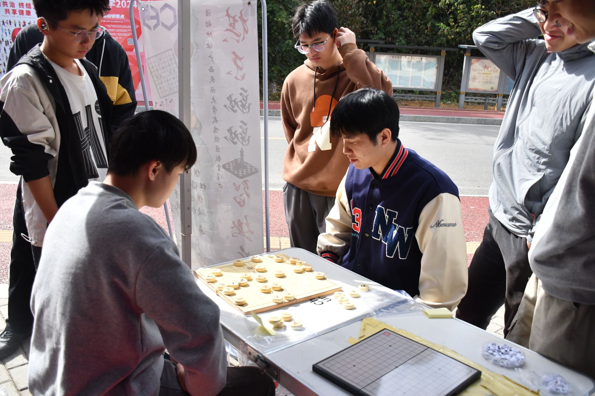 “好了,结束了。”“不行!再来一局!”同学们在棋逢对手环节中找到了与自己棋艺相当的对手,展开了一场场激烈而精彩的对弈。他们或凝神静气,或眉头紧锁,每一步棋都经过深思熟虑,仿佛在与对手进行着一场无声的对话,而每当有人落下关键一子,都会引来周围观众的阵阵惊叹和掌声。许多同学沉浸在下棋的乐趣之中,驻足不愿离开,他们在这里找到了志同道合的朋友,互不相识的陌生人也能坐下静静体会下棋的乐趣,通过棋艺的交流,彼此之间的友谊也悄然生根发芽,真正实现了以棋会友。