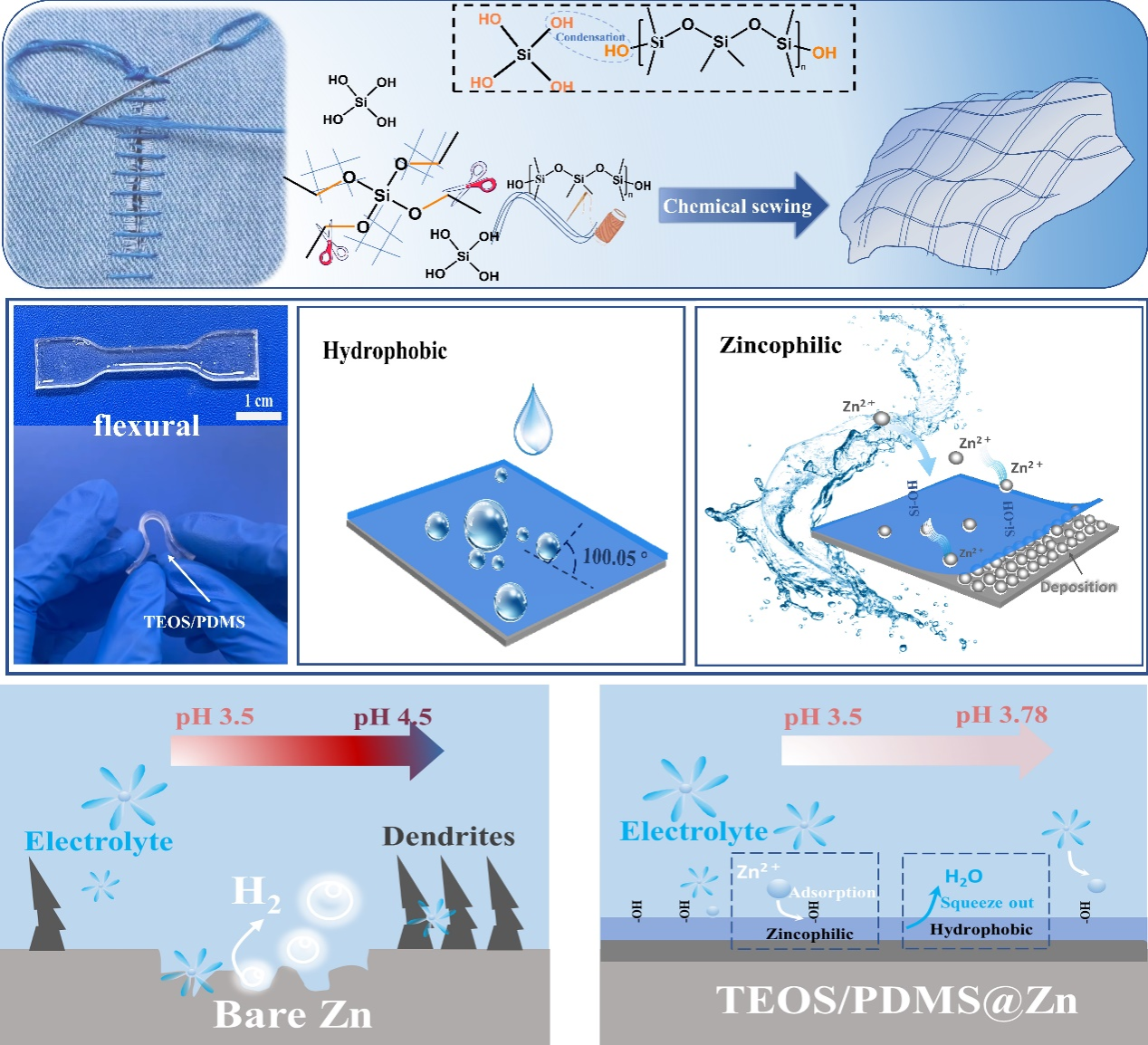 颜东亮教授团队联合张培新教授团队提出了通过化学裁剪的方法制备无机有机杂化人工保护层,以解决目前锌离子电池存在的析氢析氧反应,枝晶生长和电解液的腐蚀等问题。此保护层具有柔韧性,可以轻松弯曲。因此,它能在机械应力作用下抑制树枝状突起的生长。此外,该保护层的外表面由疏水链组成,可阻止水分子进入,从而抑制锌金属的腐蚀。保护层中丰富的Si-OH键作为亲锌位点,可加速锌离子的移动。同时,Si-OH键容易与电解质中的水形成氢键,从而抑制析氢析氧反应。由于多种功能基团的协同作用,所构建的人工保护层在电化学方面表现出卓越的性能。