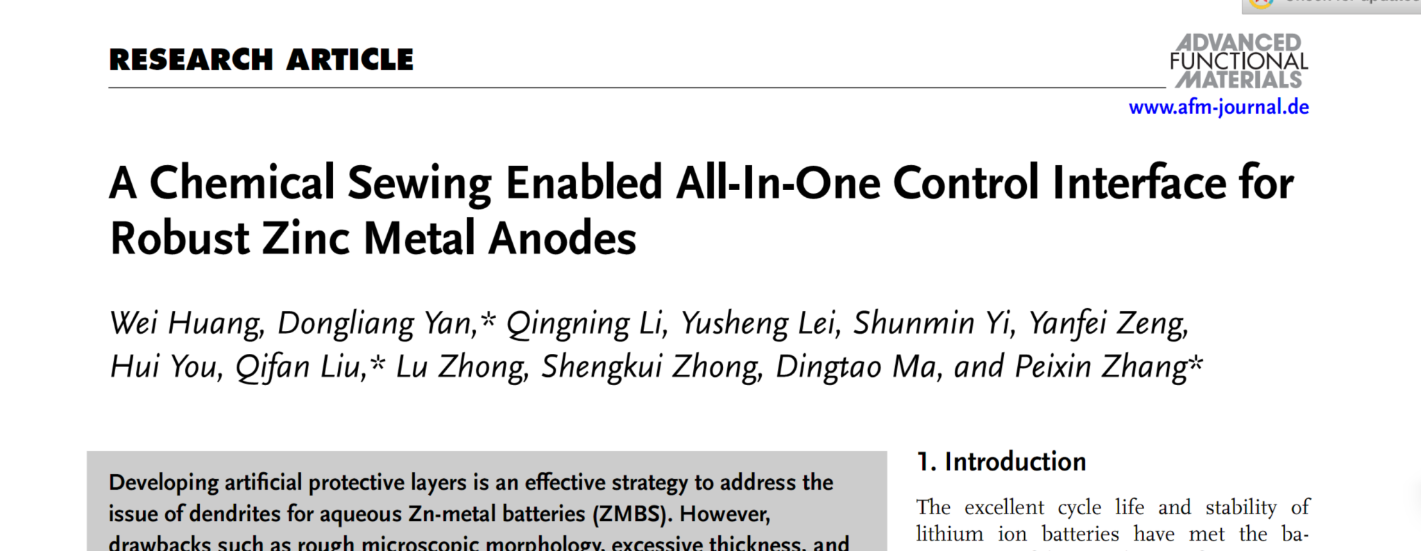 近日,公司伟德体育颜东亮教授团队与深圳大学张培新教授团队合作在锌离子电池研究领域取得重要研究进展,相关研究成果以“A chemical sewing enabled all-in-one control interface for robust zinc metal anodes”为题发表在材料学国际顶级期刊《Advanced Functional Materials》上,这是公司首次以第一完成单位、第一通讯单位在该权威期刊上发表研究成果。
